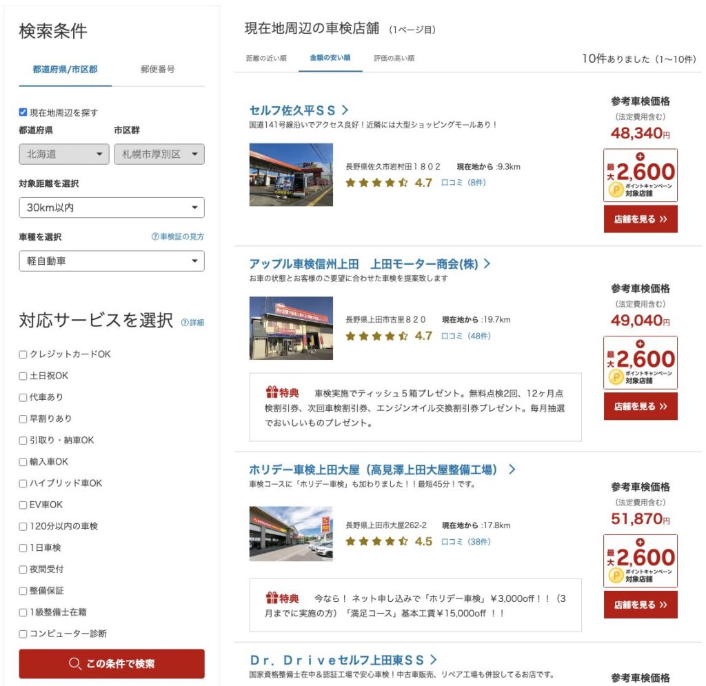 「参考車検価格」が安い順に並び替えられるので、一番安いお店が一発でわかります。