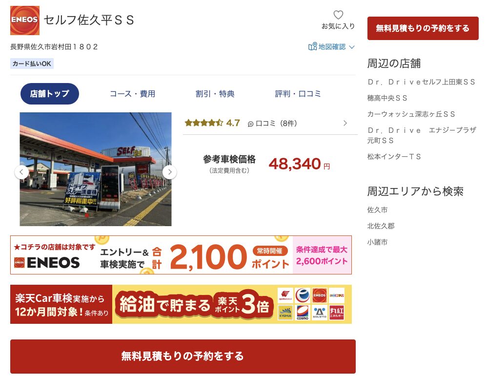 楽天Car車検は、掲載店舗数No.1の車検見積もりサイトです。加盟店舗数は6,000店舗以上なので、価格が安いところや外車OKなところなど希望に合った店舗を近隣から見つけることができます。